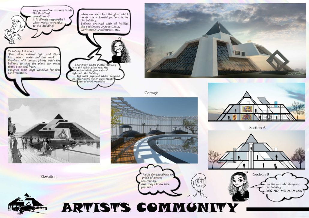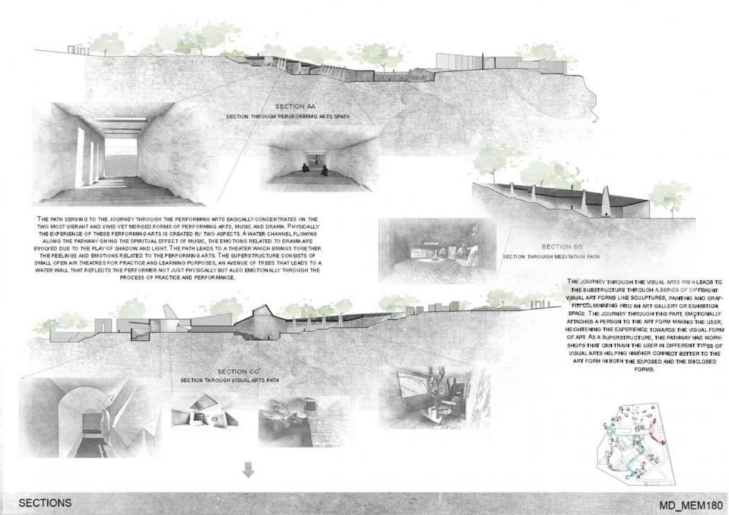 The use of dynamic architecture, optimal viewsheds from the site and the assorted treatment given to various functions, creates the appropriate environment for artist and art students. The entrant captured the essence of the ideas competition through their unique architectural treatment where the roof was considered an equally important façade as the typical four walls. The orientation of the built form allowed for the creation of differing spaces, each with their own unique treatment.